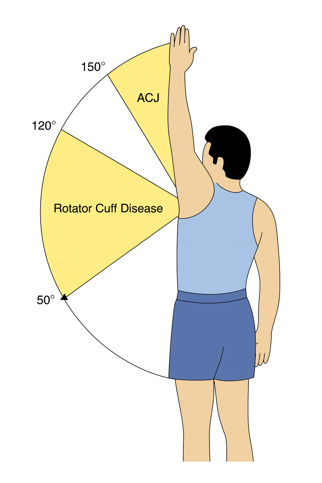 The test in reference is called the painful arc test. It gives you a broad idea of if your shoulder pain is coming from a muscular disorder, or a joint disorder.  Check out the image to the right, it is actually quite simple. You place your arm by your side, have your palm facing forward, and raise your arm up towards your head while keeping your arm in line with your body. If you have shoulder pain in the middle portion of the range of motion, you are likely to have some sort of muscular dysfunction in your rotator cuff. If there is shoulder pain at the top of the range of motion, you are likely to have some dysfunction in the joint where your shoulder blade meets your collar bone, this is called the acromioclavicular joint.